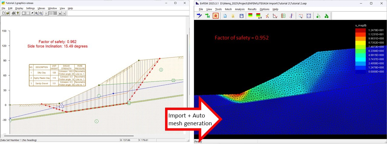 With the import function available in EnFEM , users can quickly import a UTEXAS4 data file and perform a Strength Reduction Finite Element Method (SRFEM) slope stability analysis within minutes. EnFEM reads the UTEXAS4 data file and automatically generates the slope geometry, distinct soil regions, material properties, groundwater table, tieback elements, surcharge loading, and boundary conditions based on the original UTEXAS4 model. EnFEM also uses an automatic mesh-generation function to display the mesh distribution on the screen, allowing users to preview and adjust mesh sizes if needed. In most cases, the user can initiate the computation without making any changes.